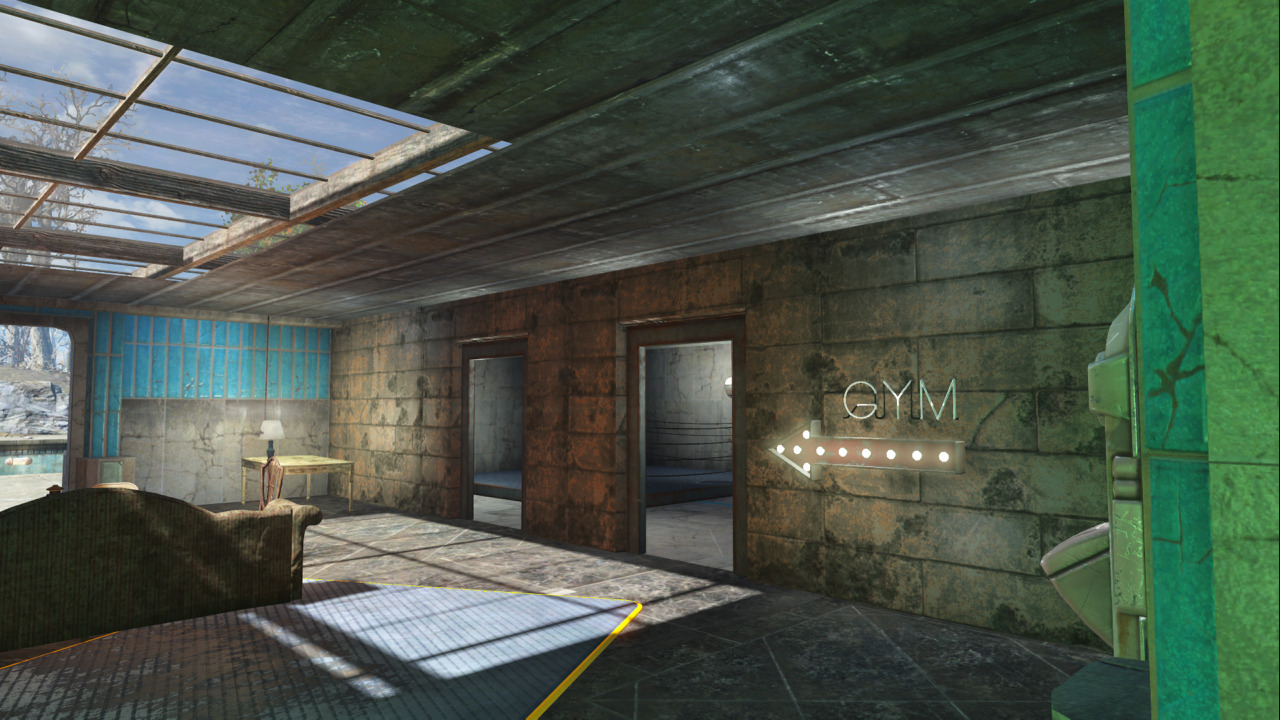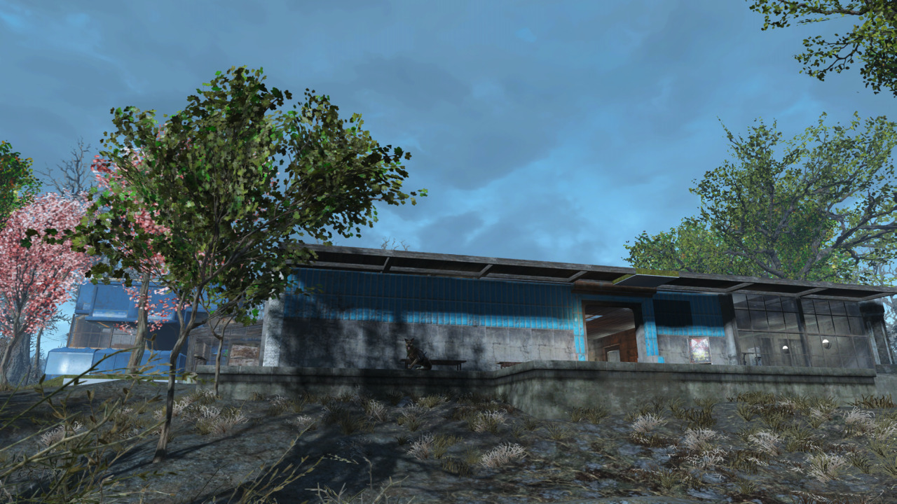 Oh hey I never showed you guys my finished version of The Slog! The main building has been repurposed as a gym now (possibly it was one pre-war anyway?) and the Vault-Tec blocks are the living quarters.