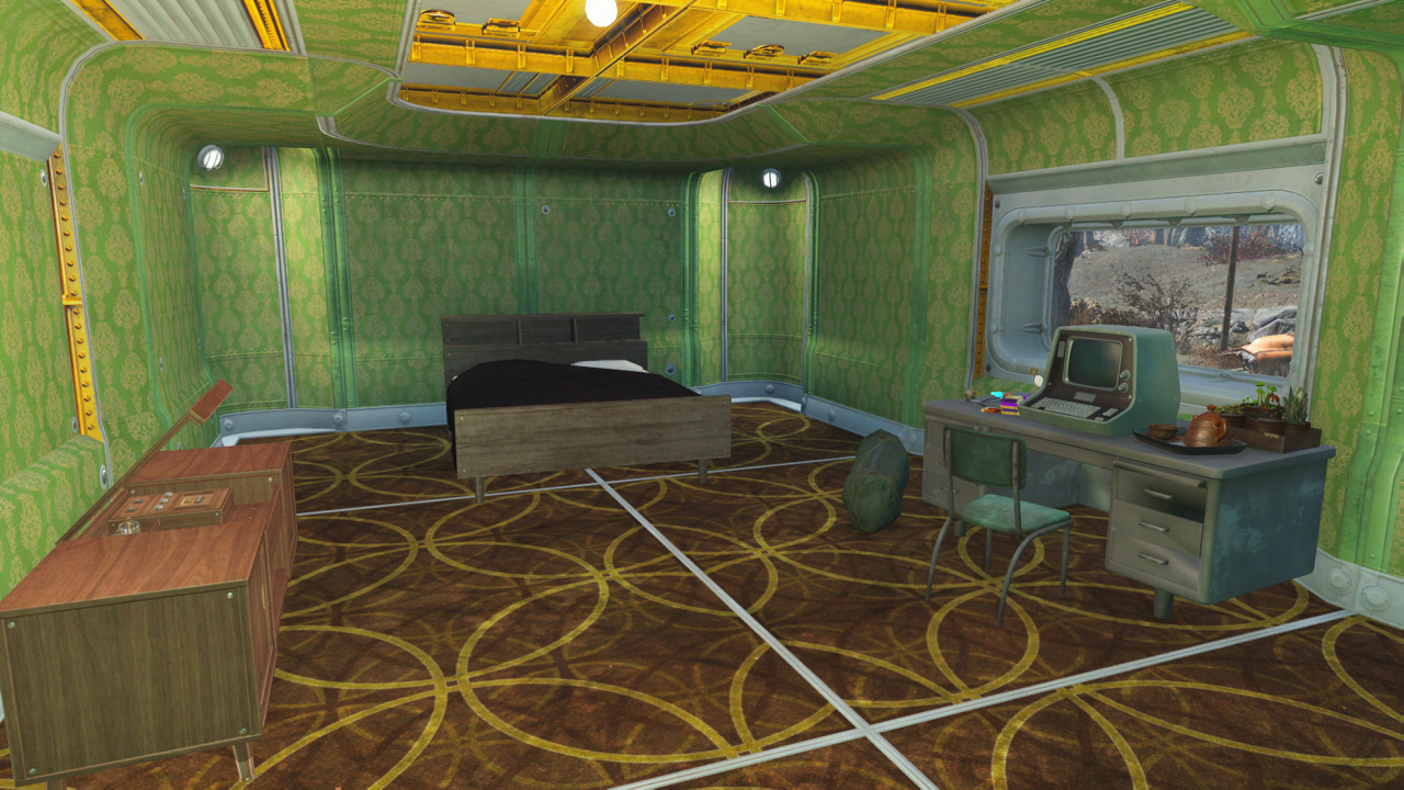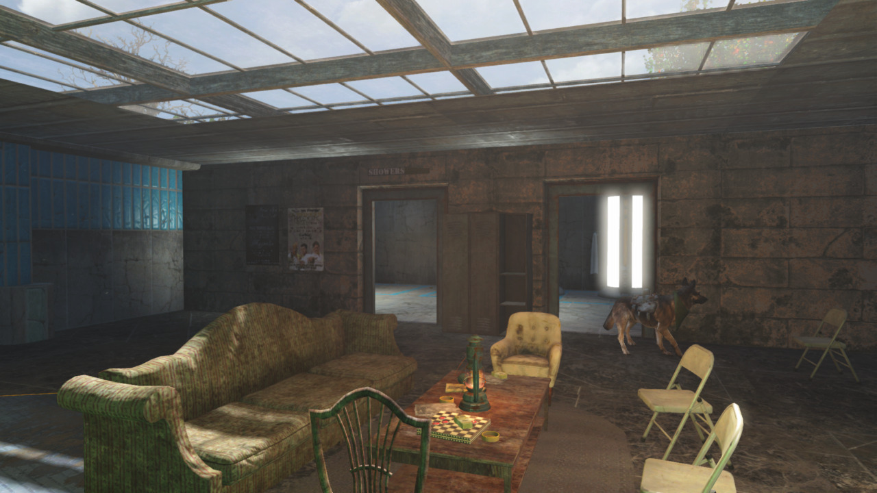 (* featuring: a lovely Ghoul receptionist, a removing-radiation area, some beds behind the glass window, a bathroom, an eating area/kitchen of sorts for the many malnourished wastelanders, a couple of handy scanners ‘n stuff)