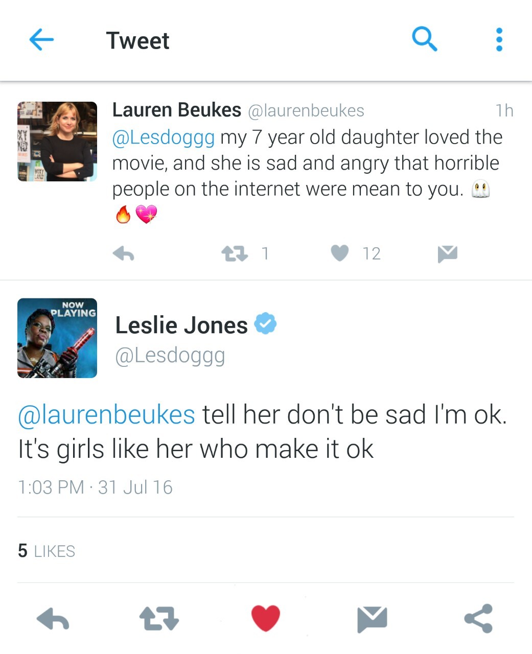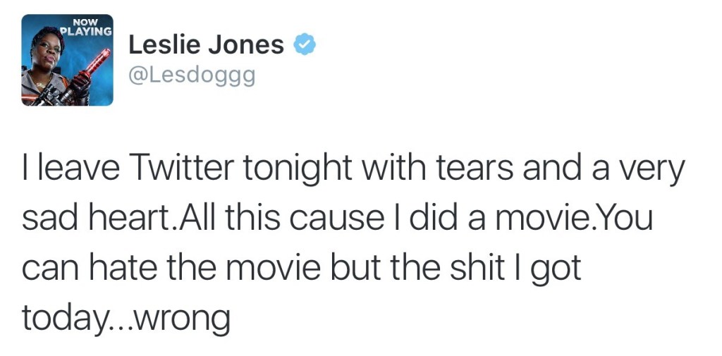 Leslie Jones is a beautiful and talented human being and doesn’t deserve any of the shit she’s getting. no one does.