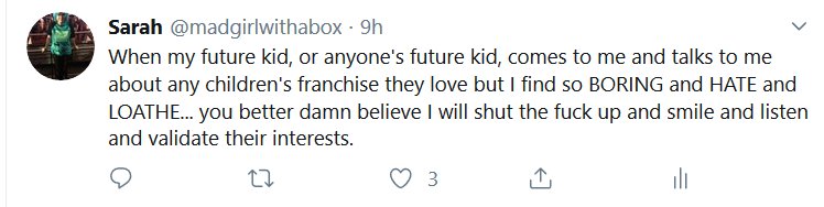 I have very little taste for the gatekeepers of Star Wars fandom, as you can tell. I’m determined to never be one. Here’s the tweets I wrote in reply to the thing I found on Twitter.