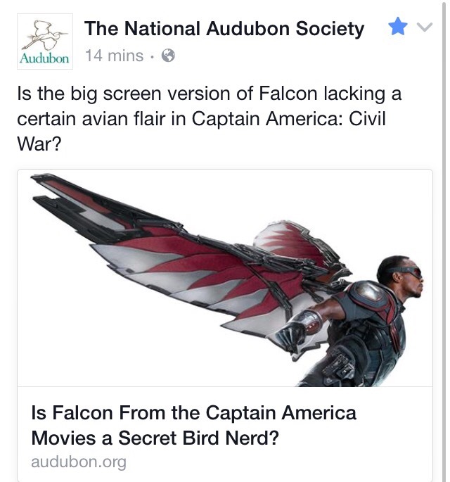 my facebook feed is so much better since I followed the National Audubon Society. for example: this completely unbiased article on why Anthony Mackie’s Falcon would be better if he could speak to birds like he does in the comics.