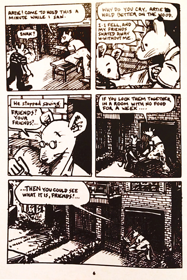 Art Spiegelman’s Maus is one of the most famous, most heartbreaking and most horrifying deceptions of the Holocaust that I can think of. The page on the left is the opening scene, in which Spiegelman recollects an old conversation he had with his father Vladek, a concentration camp survivor. “I fell, and my friends skated away without me.” “Friends? Your friends?” Vladek answers. “If you lock them together with no food for a week, then you could see what it is, friends!”