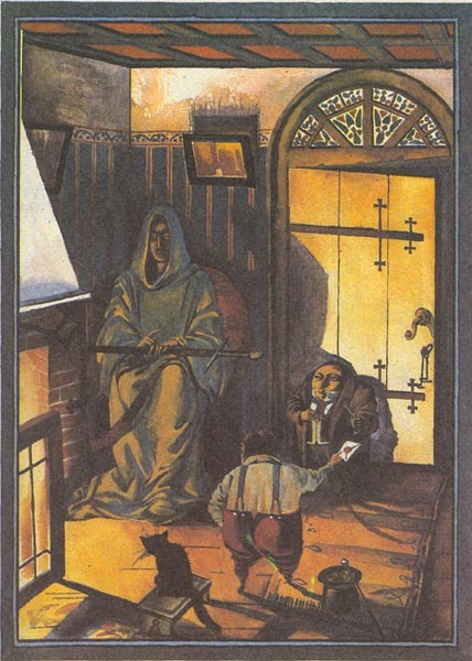 - When he stumbles towards the road looking for civilization, he finds a pale woman with a deadly staff and what looks like a child, with a shock of bright hair.