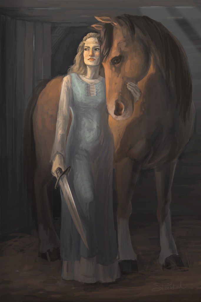 Eowyn has had a special place in my literary pantheon since I first read the Lord of the Rings when I was thirteen. I created numerous drawings of her, some of which are most likely still buried in my old high school portfolios. She represented so many things I hoped (and still strive) to be: brave, committed, loyal.