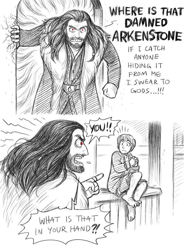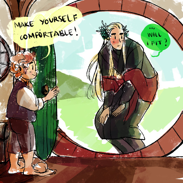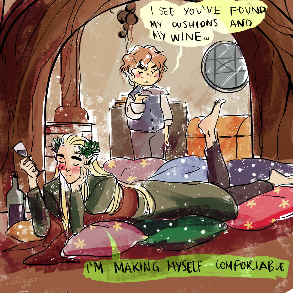 Thranduil visiting Bilbo in the Shire, being a too comfortable guest and an emotional drunk.