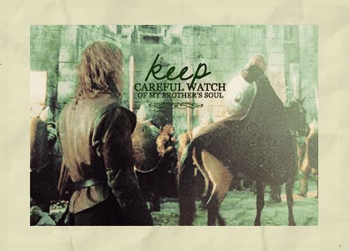 so when Faramir goes through Boromir’s room after his death, he finds all the letters in a drawer and so he brings out all of the old ones he’s kept and sits on his brother’s bed and reads them. he manages to keep from weeping until he comes across one of the short ones Boromir sent a few years ago, which contains a particularly stupid joke and came by the hand of a messenger who was under the impression that the letter was urgent. and he can hardly bear to think that the one who considered laughter so urgent is dead, and will never send him absurd letters again.