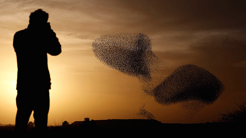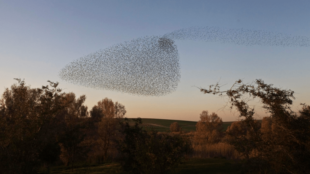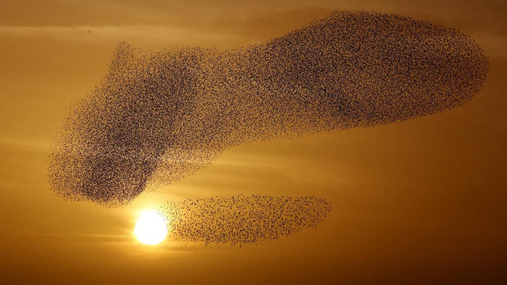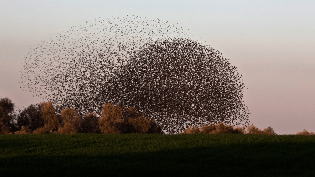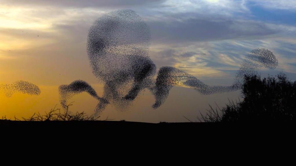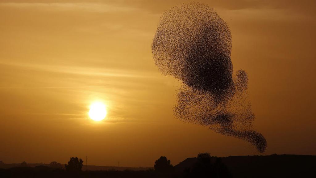 a murmuration of migrating starlings fly in a formation near the southern israeli town of rahat this week. the synchronised movement is designed to help starlings catch prey, keep them warm, and ward off attacks from large birds of prey