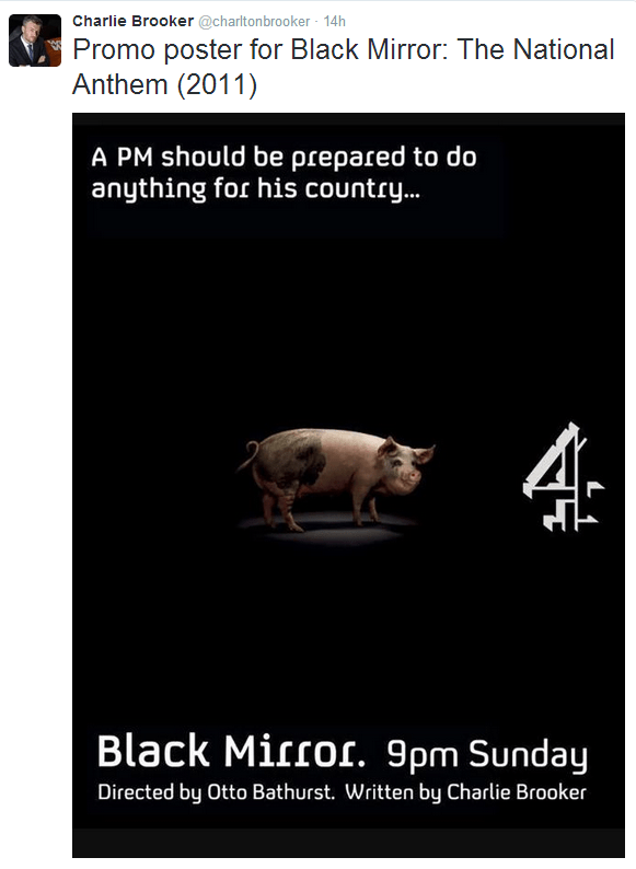 obviously everyone’s widdling themselves laughing over this because it is FUCKING HILARIOUS. many people are pointing to an old episode of british tv show black mirror in which the (fictional) prime minister fucked a pig as some kind of terrible, terrible prophecy.