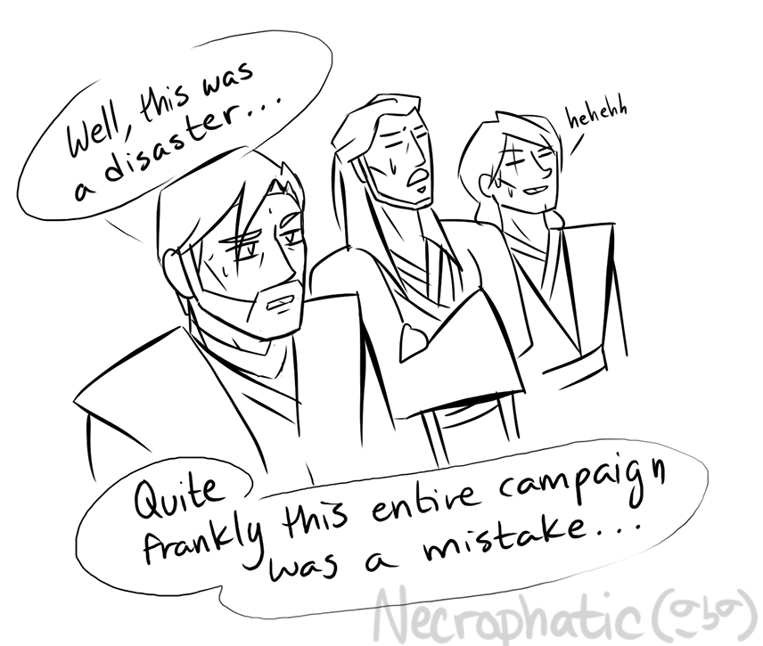 (Sidenote: So there’s a war on. Dark and full of terrors, as wars ever are. And you take a broken old man whose superpowers include feeling other beings’ suffering, and whose coping mechanisms include that friend-to-all-living-things, bring-home-all-the-strays shtick, and you stick him in that war, that galactic-scale war where he can’t even come close to 1% of 1% of saving everyone. Yeah, it’s not going to go well. Were I to write a General Jinn AU, it’d read like “Shatterpoint”. Or *worse*.)