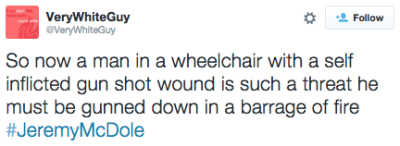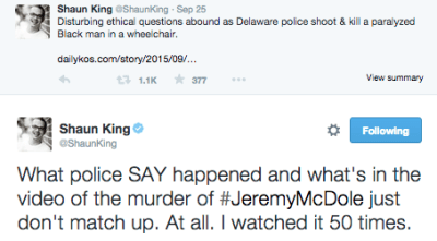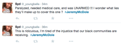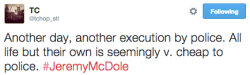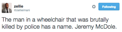 McDole sits at a unique intersection often ignored in the conversation on police brutality: violence against people who are potentially suffering through a mental illness and those who are a living with a physical disability. He also is one on a growing list of people who the police were originally called out to help, but instead were killed (like James Anderson several days later). These victims of state violence are often the most convenient to label as worthy of lethal force, as many do in fact have a weapon. However, even when police are aware of the potential mental state of these citizens, they do nothing to adjust their approach/tactics. In essence, people like McDole are doubly pathologized, not just for being black but for also being sick. More must be done to uplift the stories of Tanisha Anderson, Janisha Fonville, Lavall Hall, James Anderson, and countless others who have been stolen from us. Rest in Power. We fight for you now too. #staywoke #farfromover
