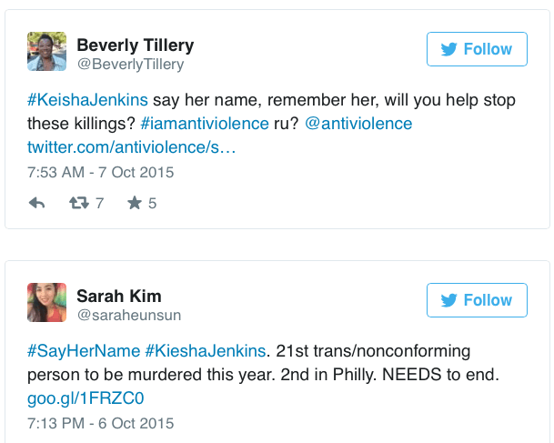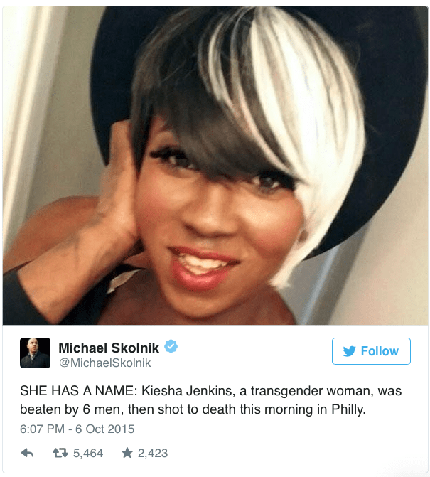 Philadelphia homicide Capt. James Clark told the Philadelphia Inquirer that Jenkins, 22, exited a car moments prior to her murder. Once out of the car, the group surrounded Jenkins and when she fell to the ground during the assault, they was shot twice in the back. Jenkins is the second transgender woman to be killed in Philadelphia this year and the 21st in the U.S. This is a dire problem, and as Laverne Cox recently said, fixing it starts with representation.
