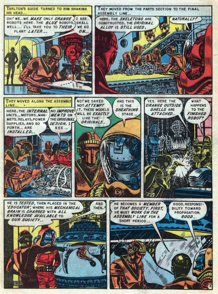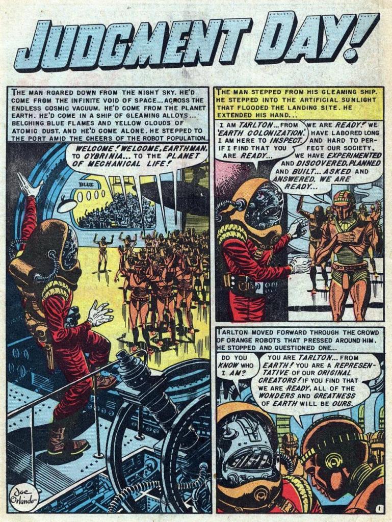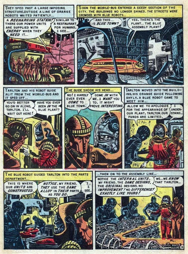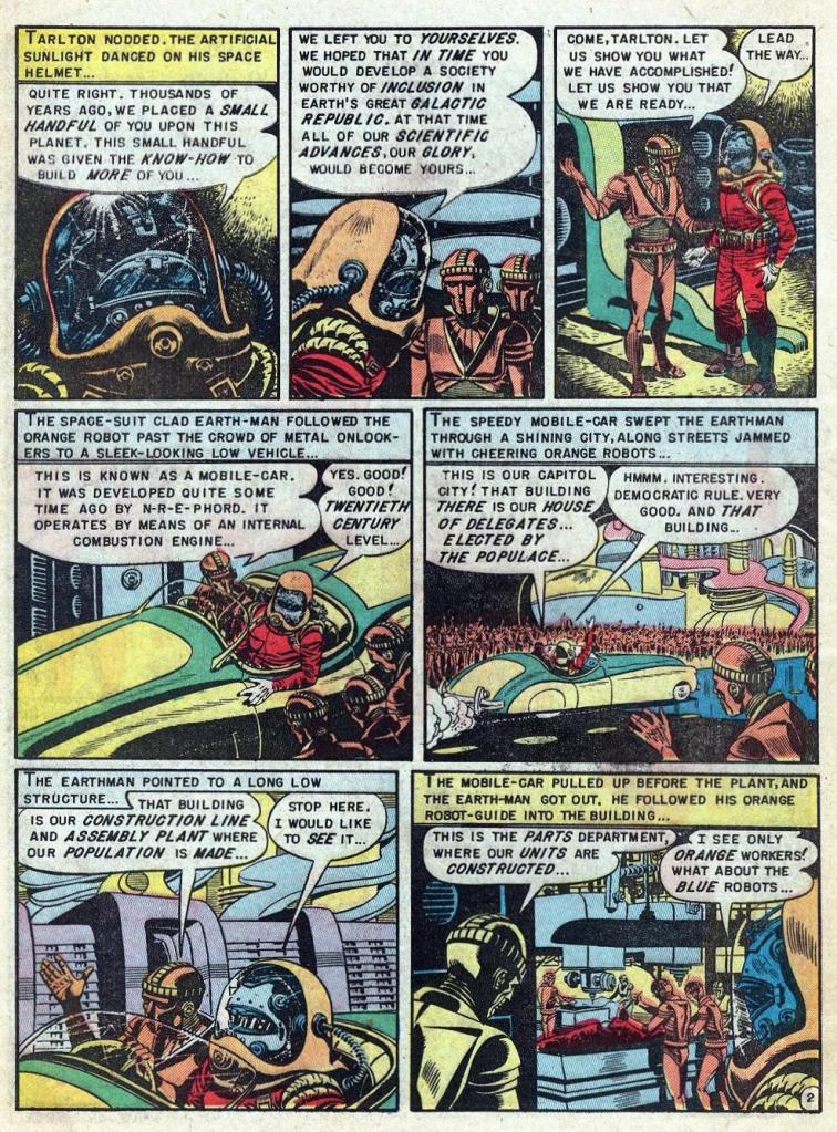 The story depicted a human astronaut, a representative of the Galactic Republic, visiting the planet Cybrinia inhabited by robots. He finds the robots divided into functionally identical orange and blue races, one of which has fewer rights and privileges than the other. The astronaut decides that due to the robots’ bigotry, the Galactic Republic should not admit the planet. In the final panel, he removes his helmet, revealing himself to be a black man.