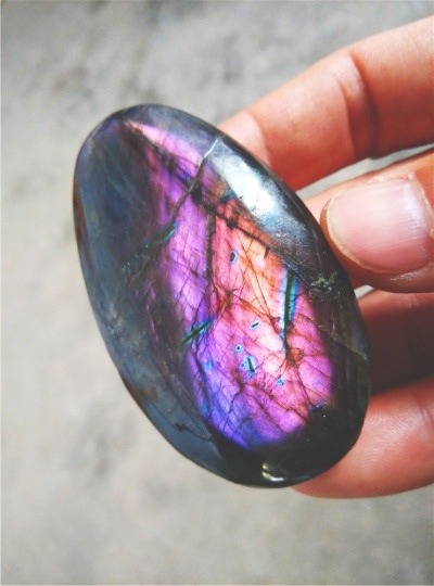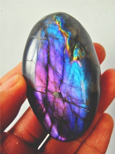 Labradorite: with this gem, light reflects off the crystal structure in such a way that the rock has really strong blue-green iridescence, and it looks different every way you turn it – the light will hit it in one spot and the dull grey rock will suddenly explode with all this amazing blue color