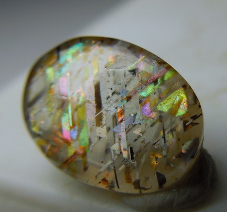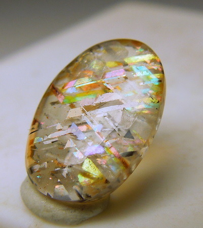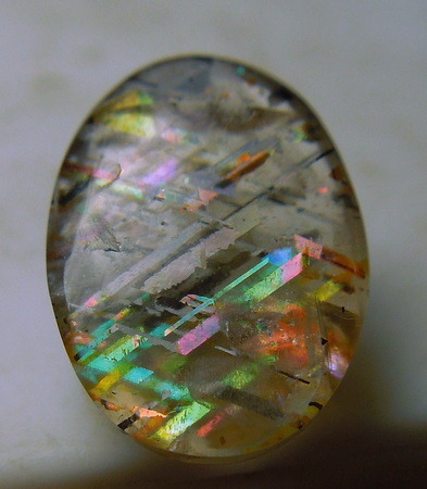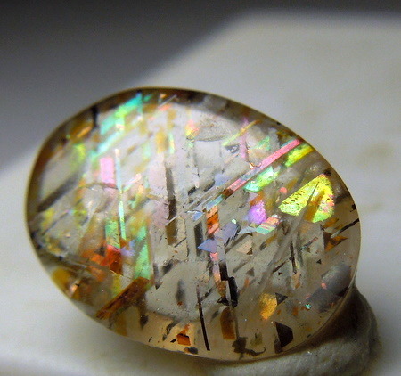 Orthoclase with a lattice pattern inclusions of llmenite and Hematite. The inclusions are actually dark but when light hits the stone at just the right angels it shines with beautiful iridescence! Harts Range, Australia