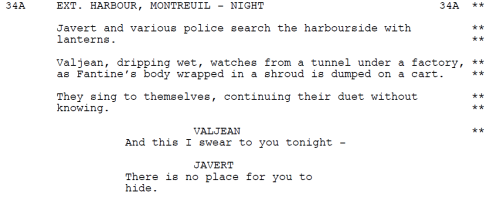 It’s either that, or a continuation of this one (Javert having apparently taken the time to button up his jacket and put his hat on) with the camera panning up from Valjean’s hiding place to Javert watching the river above: