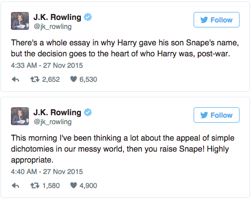 – Finally, Snape dies while an undercover agent for Voldemort, and his dying wish is to give Harry his memories so that Harry will know his story, and to look into his eyes, which are a reminder that Harry is Lily’s son. Suddenly, it makes sense that Snape genuinely turned against Voldemort out of remorse – the woman he loved died, and his own actions brought her death. I don’t think that Snape is forgiven for the fact that he was cool with James and baby Harry dying so long as he could have Lily afterward, I don’t remember how explicitly that’s addressed but I feel like I remember Dumbledore being disgusted with him (Deathly Hallows is the book I’ve read the least). But what I do know is that knowing that because he loved his mother, his turn to the Order was sincere, Harry forgives him for everything else he’s done enough to name a child after him.