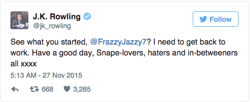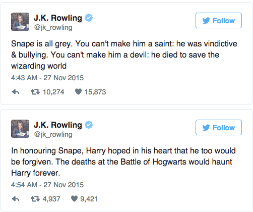 All true (God, do I hate Snape. The Malfoys, too. Why the hell do they get off so easy?!) but I always wonder how much JKR herself being a victim of abuse* ties into it. Because I always feel like that must play a part in what she wrote about Snape, but… I don’t really know how to analyse or make anything coherent out of that.