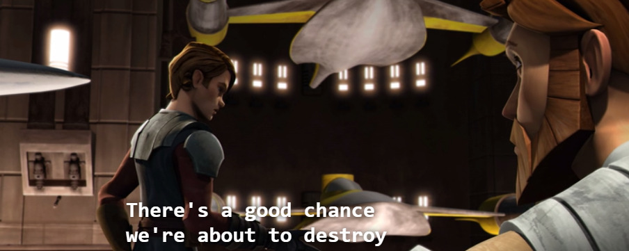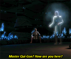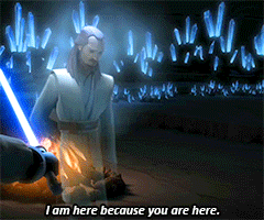 But it makes sense. Obi-Wan has spent years and years forcing himself to accept Death, Qui-Gon’s in particular. This apparition throws everything he knows into a tailspin. He doesn’t believe it. And (in my own personal interpretation, which absolutely no one is obligated to share), I don’t think he believes it even after he puts the saber away, even after he’s had an entire conversation with this thing that walks and talks like the long-dead person he’d loved beyond measure. To me, Obi-Wan is much more likely to interpret “I am here because you are here” as “The Force is tripping on this planet and I am a projection of your own thoughts/wants/needs/memories”, because the alternative is absolutely, positively impossible, cannot be true, Qui-Gon is dead, you can’t have him back, period, the end, we’ve been over this, stop thinking about this absurdity you dealt with that a long time ago there’s a war on get yourself together Kenobi.