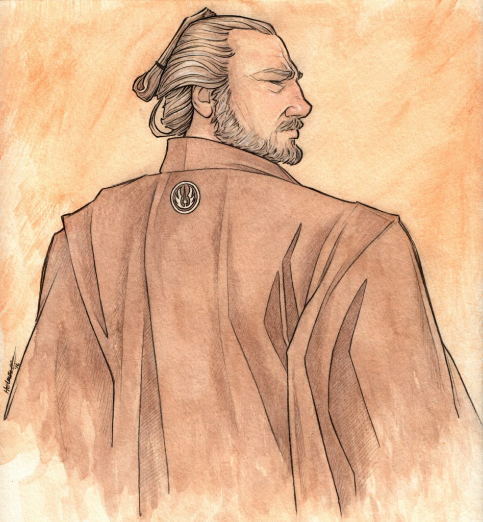 So here is my version of samurai Jedi: Qui-Gon Jinn, Edo-styling. :) Not gonna lie, my favorite part of this drawing is the Jedi-crest mon on his haori. Oh yeah, and hair…because, hair. :D I really want to do one with Qui-Gon and Obi-Wan together, but so much effort…! (Also, Qui-Gon’s hair and costume design lends itself to samuraification better than Obi-Wan’s designs do.)