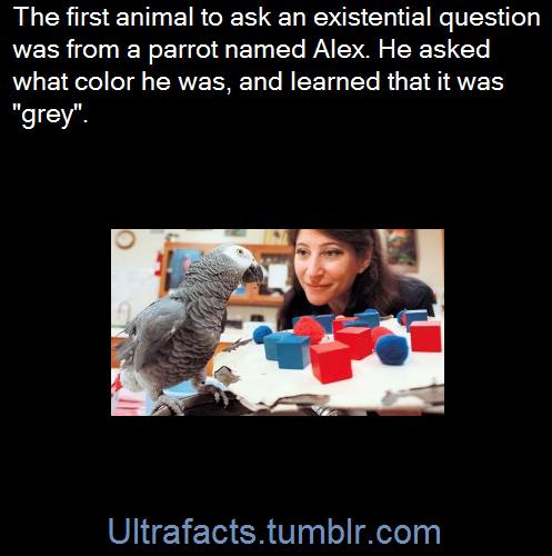 Alex (1976 – September 6, 2007) had a vocabulary of over 100 words, but was exceptional in that he appeared to have understanding of what he said. For example, when Alex was shown an object and was asked about its shape, color, or material, he could label it correctly. He could understand that a key was a key no matter what its size or color, and could figure out how the key was different from others. One day, he asked what color he was, and learned “grey” after being told the answer six times. This made him the first non-human animal to have ever asked an existential question. [x]