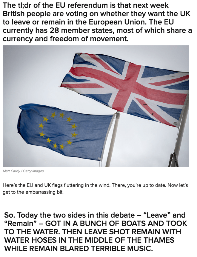 I get it. You’re apathetic. Politics is boring/corrupt/pointless, all the parties are the same, we’re screwed anyway etc etc. I FEEL YOU. Mate, do I feel you. But THIS referendum has NOTHING to do with political parties or alliances, even the muppets running this country are split. THIS is about the SINGLE QUESTION of if you want us to stay, or want us to leave.